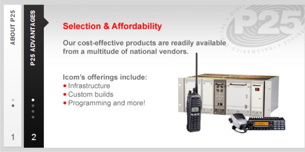 A Icom e a Radiohaus se orgulham em oferecer ao mercado de rádios de segurança pública robustos equipamentos P25 MIL-SPEC, que atendem ou superam os requisitos exigidos pelas compras governamentais. A Icom oferece uma família inteira de produtos no padrão P25 com um preço altamente competitivo. A tecnologia digital veio para ficar e a Icom tem décadas de experiência no desenvolvimento e fabricação de equipamentos de radiocomunicação de ponta e confiáveis, vendidos mundialmente. Conte conosco!