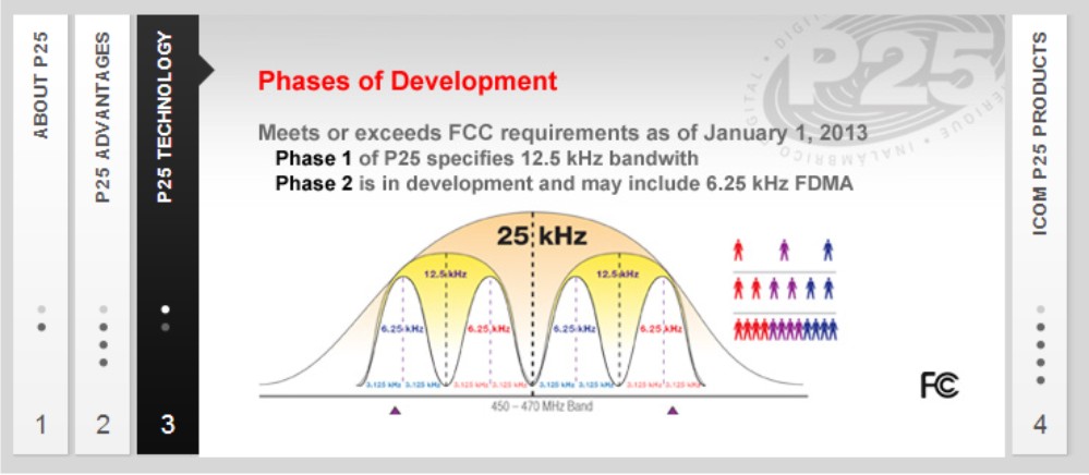 A Fase 1 do P25 especifica largura de banda de 12,5kHz